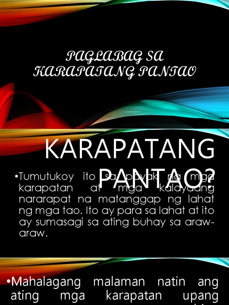 Ano ang nararapat sa iyo bilang taoAng karapatang pantao ay mga prinsipyong gumagabay sa pananaw ng tao tungkol sa pagtrato ng kaniyang kapuwa at sa dignidad niya bilang tao. Tumanggi naman na magbigay ng pahayag ang ina ng dalagita. KARAPATANG PANTAO Ang lahat ng tao ay may karapatang mabuhay nang Malaya at may dignidad.